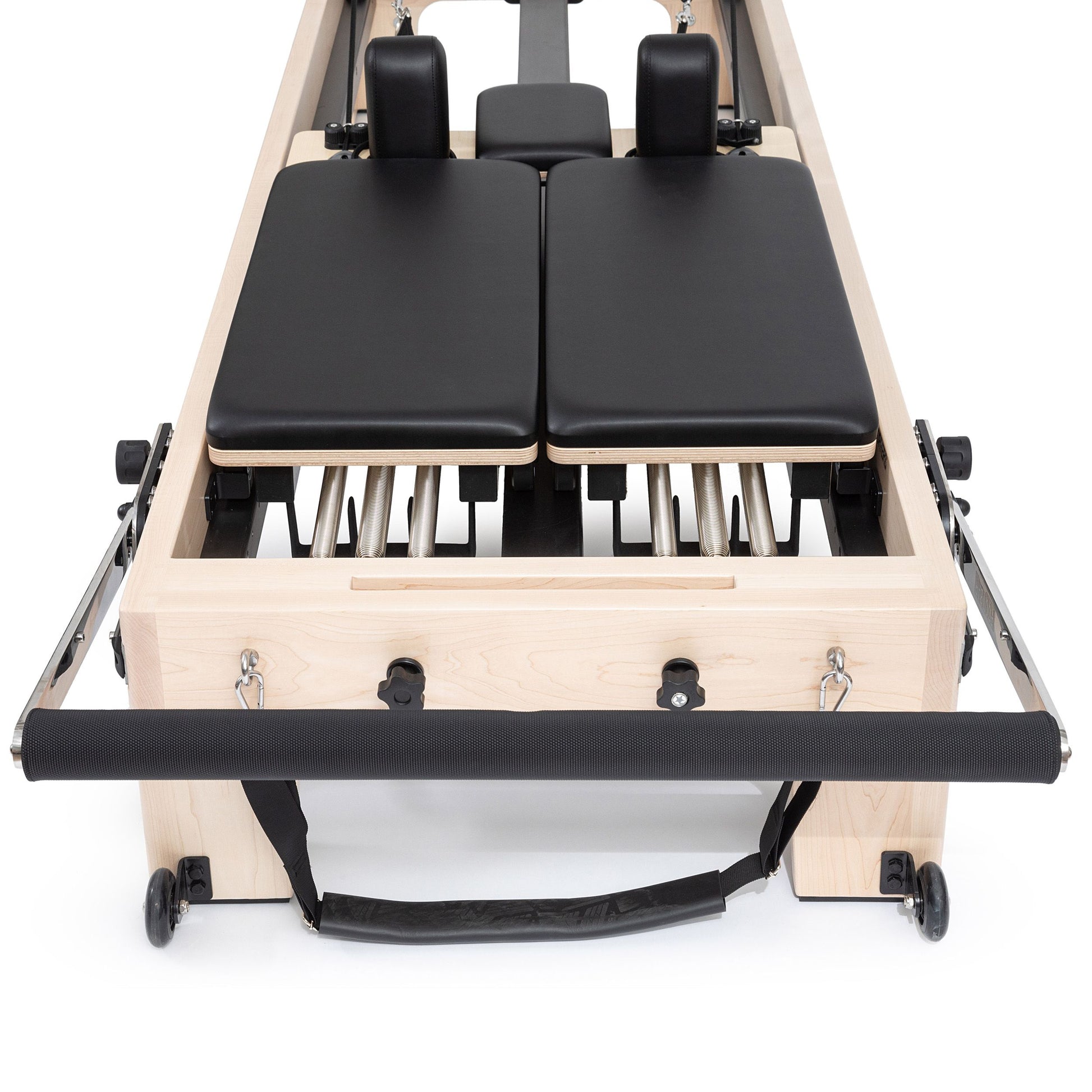 Mechanism that allows you to move the foot bar horizontally along the reformer, up to 28 different positions.